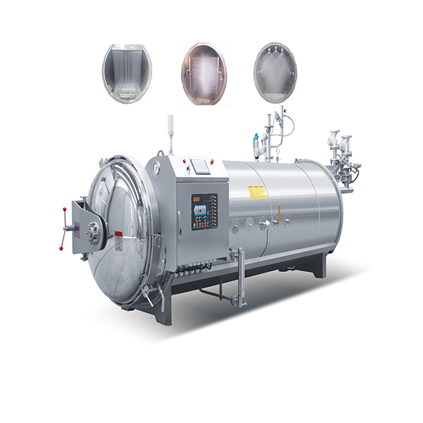 The types of water spray sterilizing autoclave retorts are divided into: top spray sterilizing retorts, side spray sterilizing retorts, and top spray and side spray sterilizing retorts.